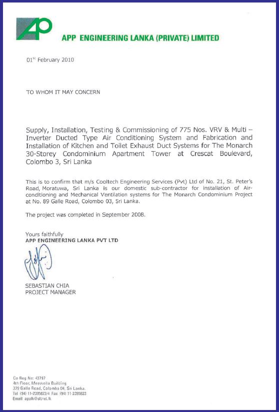 The Monarch – Crescat is a 30 Storey Luxury Apartment. The M & E Main Contractor App Engineering (Pvt) Ltd Singapore and Acmv Contractor Cooltech Engineering Services (Pvt) Ltd.